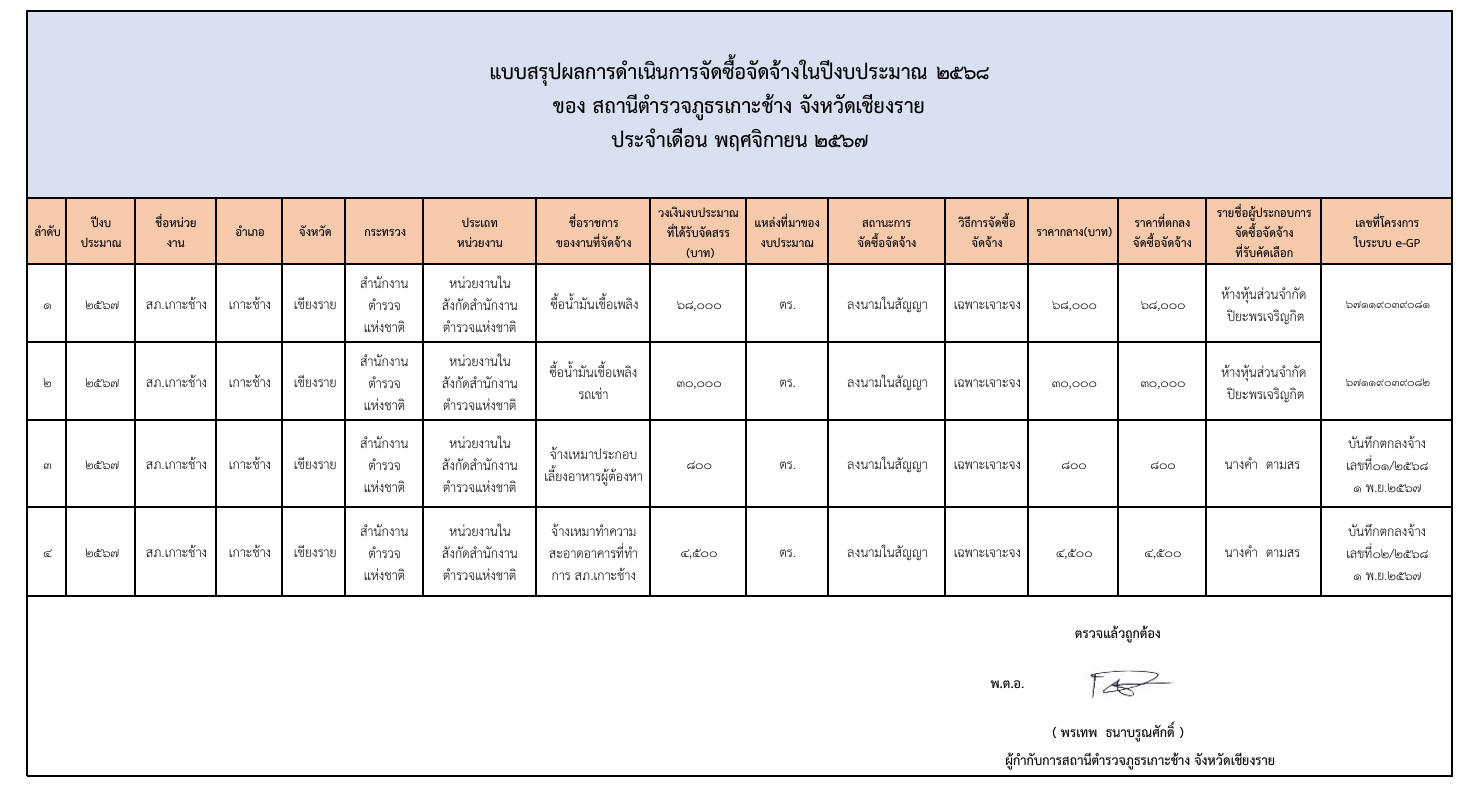 สรุปผลการจัดซื้อจัดจ้าง ประจำเดือน พฤศจิกายน พ.ศ.2567