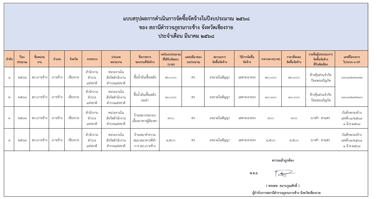 สรุปผลการจัดซื้อจัดจ้าง ประจำเเดือน มีนาคม พ.ศ.2568