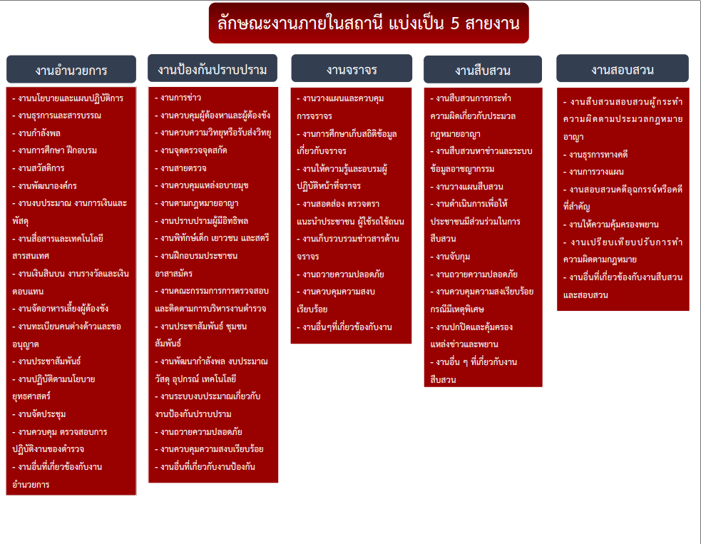 มีหน้าที่เกี่ยวกับการอำนวยการ การวางแผน การตรวจสอบติดตาม และประเมินผลงานที่เกี่ยวกับนโยบาย ยุทธศาสตร์ และแผนงานของสถานีตำรวจ งานการบริหารบุคลากร งานจเรตำรวจงานกิจการพิเศษ งานความมั่นคง กรศึกษา การฝึกอบรม งานวิชาการ สวัสดิการ การพัฒนา การบริหารจัดการ งบประมาณ การเงิน การพัสการพลาธิการและสรรพาวุธ การส่งกำลังบำรุง รวมทั้งลักษณะงานอื่น ๆ ที่เกี่ยวข้องหรือเป็นส่วนประกอบของงานดังกล่าว เพื่อส่งเสริมหรือสนับสนุนการปฏิบัติงานของสถานีตำรวจ
